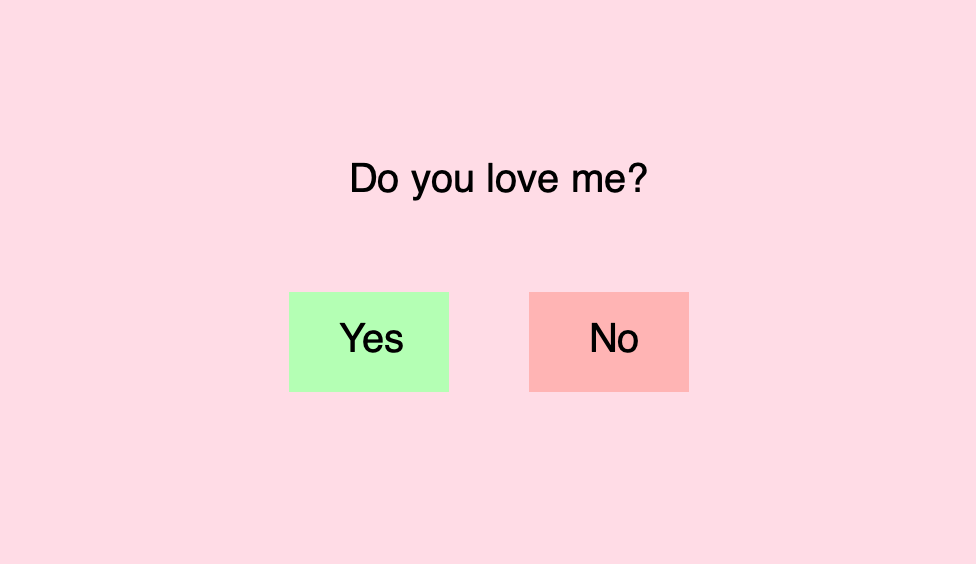 In this section, I set up the canvas and displayed the main question, “Do you love me?” near the top. I used background()to give the sketch a soft pink color and text() to show the question. Then I created a green rectangle using rect() to represent the “Yes” button, and placed the text “Yes” inside it. This sets up the first option for when I click and interact with later in the code.