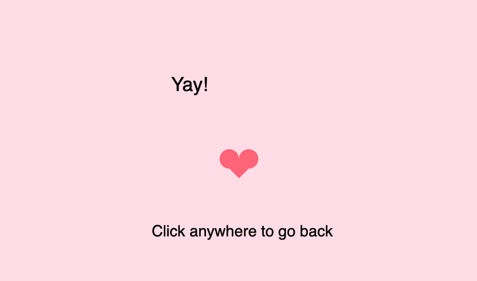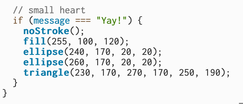 In this part of the code, I created a small heart that appears when I click “Yes.” I used two circles (ellipse()) for the rounded top sections of the heart and a triangle underneath to form the pointed bottom. This was an improvement from Week 2. The shapes are filled with a bright red-pink color to make the heart stand out, and noStroke() removes the outline so it looks smooth and unified.