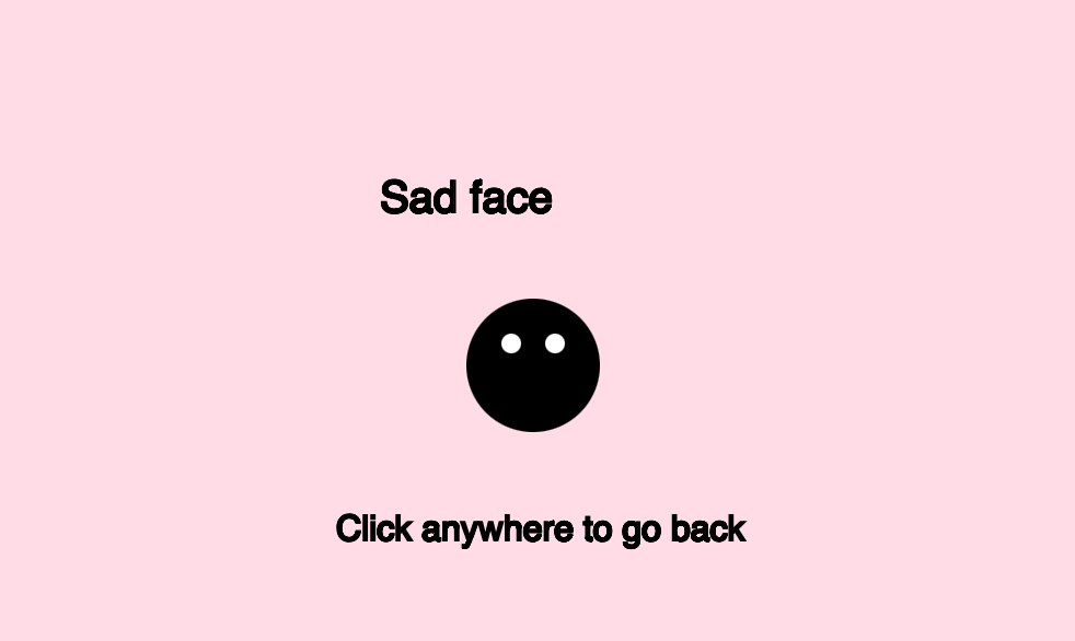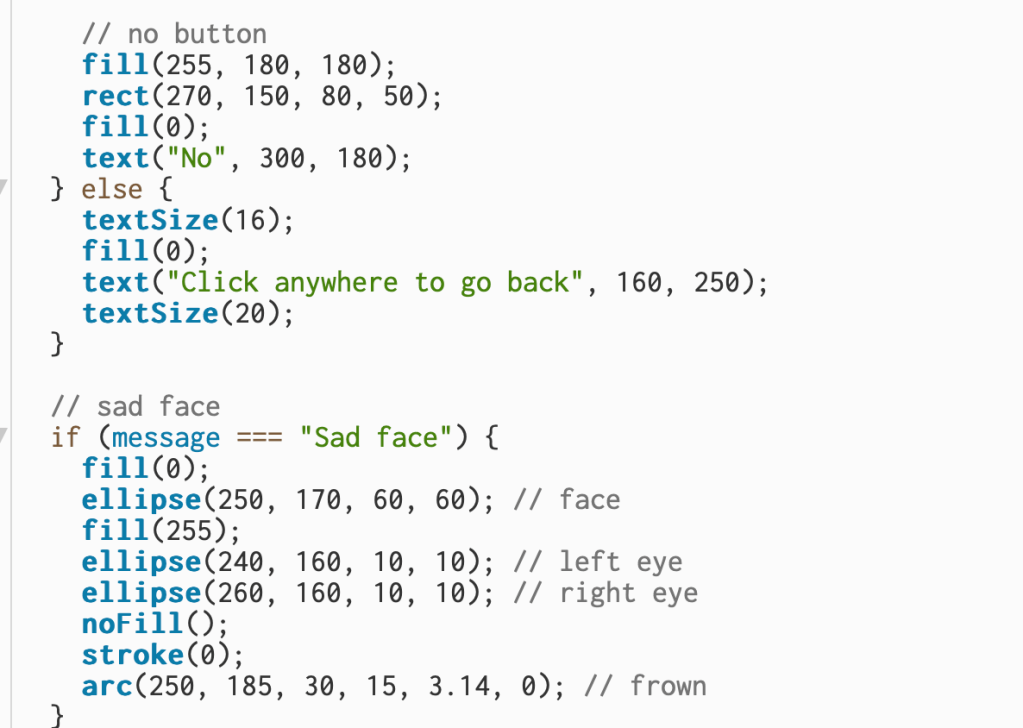 I added the “No” button so the user has a second choice. The button is a red rectangle with the text “No” on top, giving a clear visual contrast to the “Yes” option. Below that, I included a message that appears only after the I make the choice, saying myself or who is playing can click anywhere to go back. I used simple shapes like ellipse() and arc() to draw a sad face, two white circles for the eyes and a curved line for the frown – which appears when I click “No.”