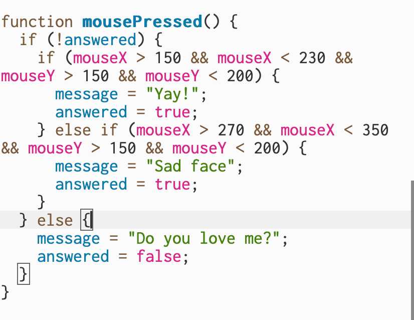 This section controls how the sketch reacts when I click the mouse. The first part checks whether the question has already been answered. If it hasn’t, it uses the mouse’s X and Y position to see if I clicked inside the “Yes” or “No” button areas, changing the message to either “Yay!” or “Sad face.” Once an answer is selected, clicking anywhere again resets the sketch back to the original question, allowing myself to play and choose again. https://editor.p5js.org/itsnandibby/sketches/1-egMnfMf