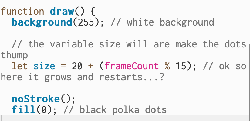 In this part of my code, I set the background to white so the pattern stays clean each time the frame refreshes. I created a variable called size that makes the dots grow slightly and then restart, giving them a thumping effect. Using noStroke()removes the outlines, and fill(0) keeps all the dots solid black for a simple look.