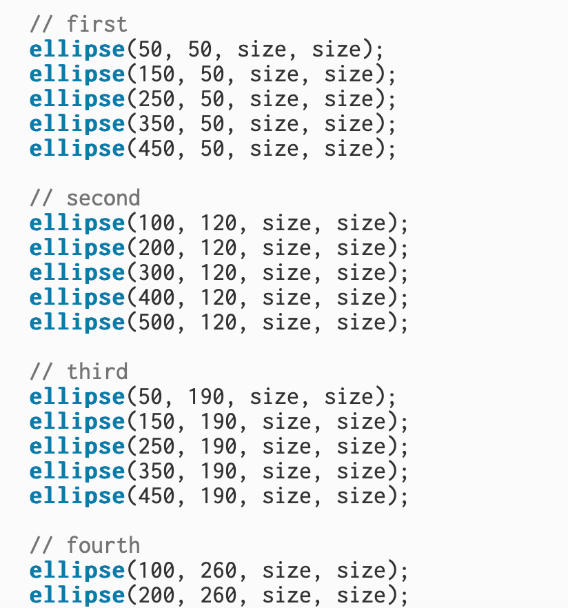 In this section, I used multiple ellipse() shapes to create rows of evenly spaced polka dots across the canvas. Each row repeats the same shape and size variable, which builds a clear, structured pattern. After placing a few rows, it became mostly repetition, copying the same line of code with different X and Y positions to fill the page and complete the design. https://editor.p5js.org/itsnandibby/sketches/hMZmgzrTF