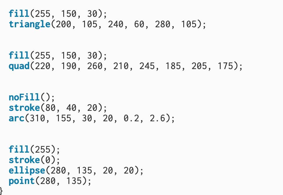 Next, I used triangle() to create the top fin and quad() for the bottom fin, both filled with the same orange tone to match the body. To give the fish expression, I used arc() with noFill() and a brown stroke() to draw a small curved mouth. I created the eye using a white ellipse() for the eyeball and a single point() in the center for the pupil.