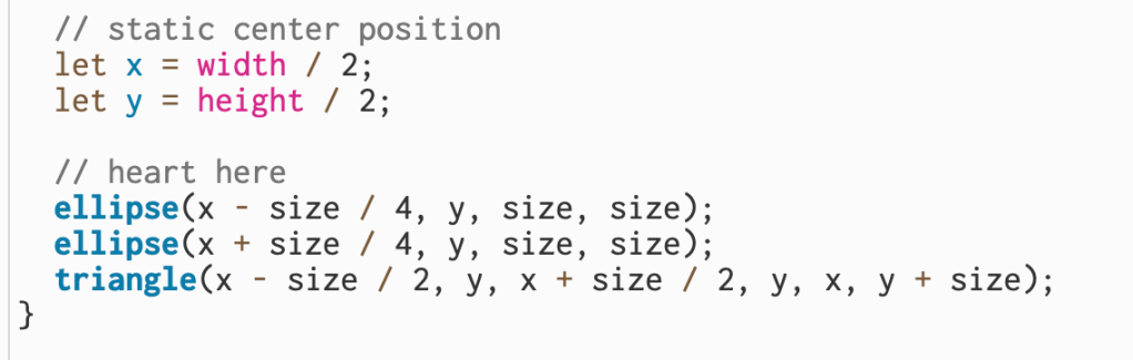 In this section, I set the static center position of the heart using width / 2 and height / 2, which kept it in the middle of the canvas. To create the heart shape, I combined two circles drawn with ellipse() for the rounded top parts and a triangle() underneath for the pointed bottom.