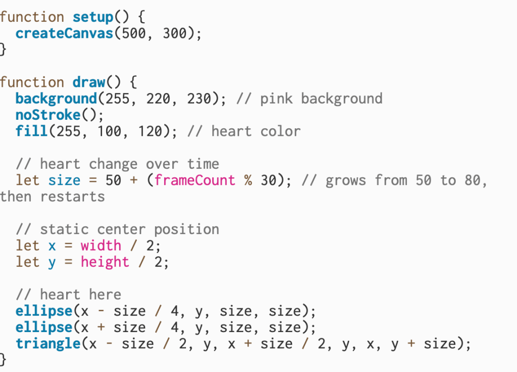 Here, I used frameCount to make the heart look like it’s beating. The line let size = 50 + (frameCount % 30)changes the heart’s size over time by adding a value that increases from 0 to 30 as the frames progress. Once it reaches 30, it loops back to 0, creating a simple growing and shrinking effect that mimics a pulse.