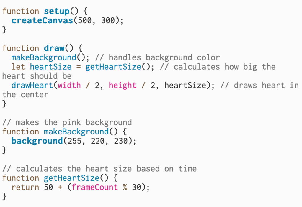 In this section, I reorganized my code so that each function has a specific job. The setup() function creates the canvas, while draw() calls the other functions to keep things running smoothly. makeBackground() handles the pink background, and getHeartSize() calculates how big the heart should be as it “beats.”