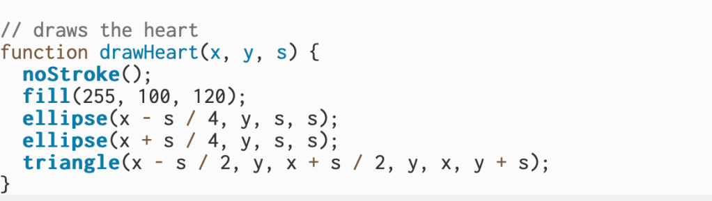 The drawHeart(x, y, s) function is responsible for drawing the heart on the screen. It uses the values from draw() to decide where the heart goes and how big it should be. Inside, it removes the outline, fills the color, and uses two ellipses and a triangle to form the full heart shape.