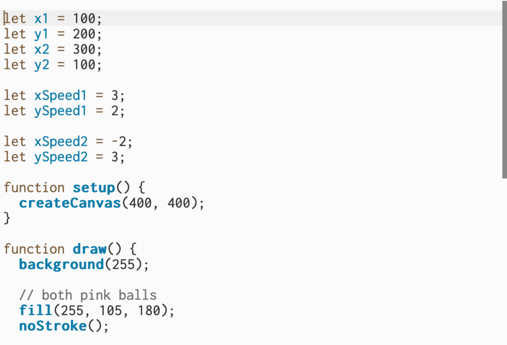 For the first question I created movement for both pink balls and made them bounce around the screen. I set each ball to move in its own direction and update its position every frame so it looks like they’re floating across the canvas. I also added conditions to check when a ball hits the edge of the screen — once that happens, the direction switches so it bounces back instead of getting stuck. Overall, this section controls all the motion and keeps both balls moving smoothly inside the frame.