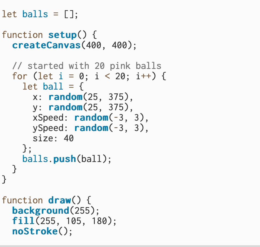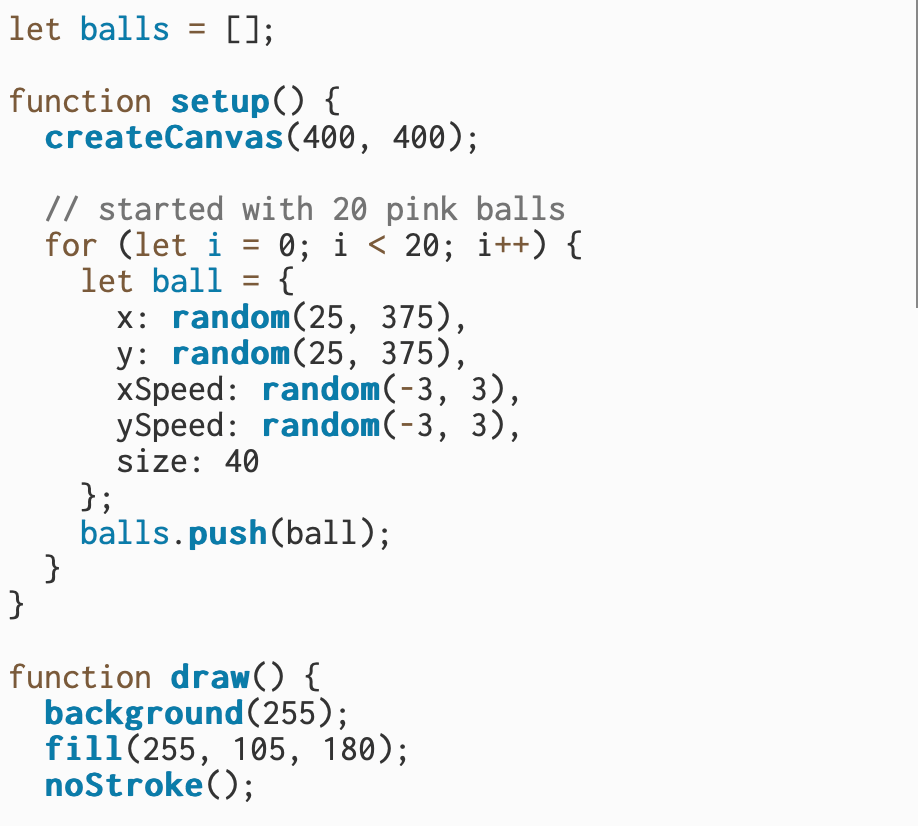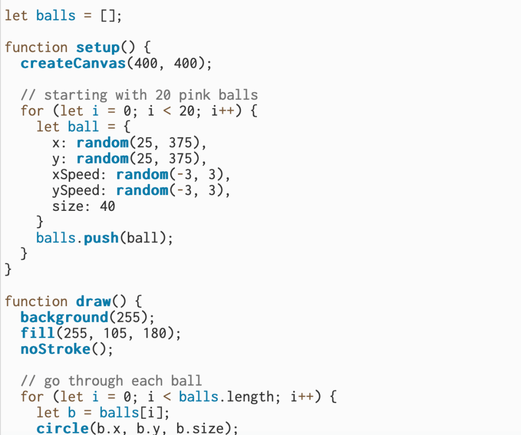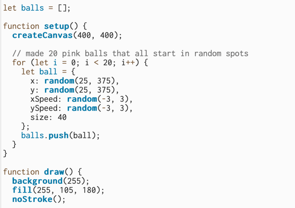 I built on the two-ball sketch and made twenty pink balls that all move on their own. Each ball starts in a random spot with a slightly different speed so they don’t all move the same way. I used a loop to go through every ball and update its position each frame, which makes the animation look busy and alive. I also kept the bounce logic from before, so when a ball hits the edge of the canvas, it flips direction and keeps moving. Overall, this version shows how I can take a simple idea and scale it up to make something more dynamic.
