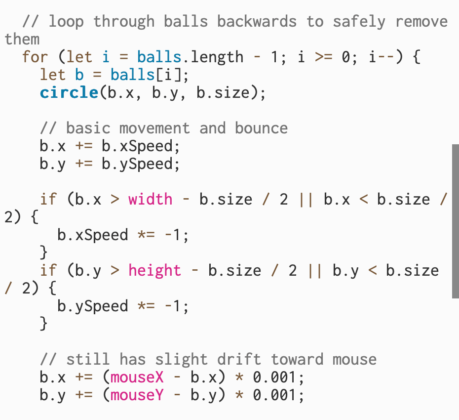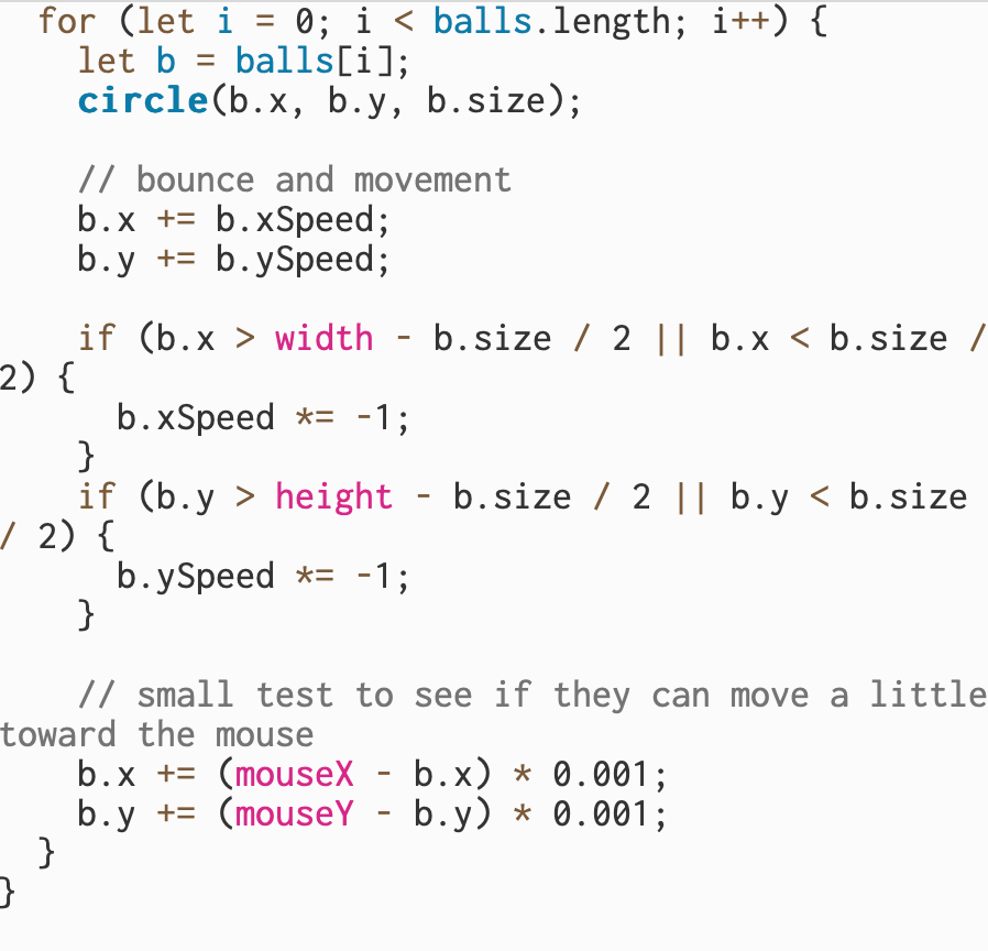 For this part, I started experimenting with how to make the balls move toward the mouse. I added a small change so that each ball slowly drifts in the direction of where my mouse is on the screen. It’s not perfect yet, it moves really slowly and don’t fully follow the mouse the way I wanted, but I got the basic idea working. I was trying to figure out how to control the speed and make the movement smoother, but I stopped here once I got a small reaction from the balls.
