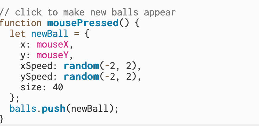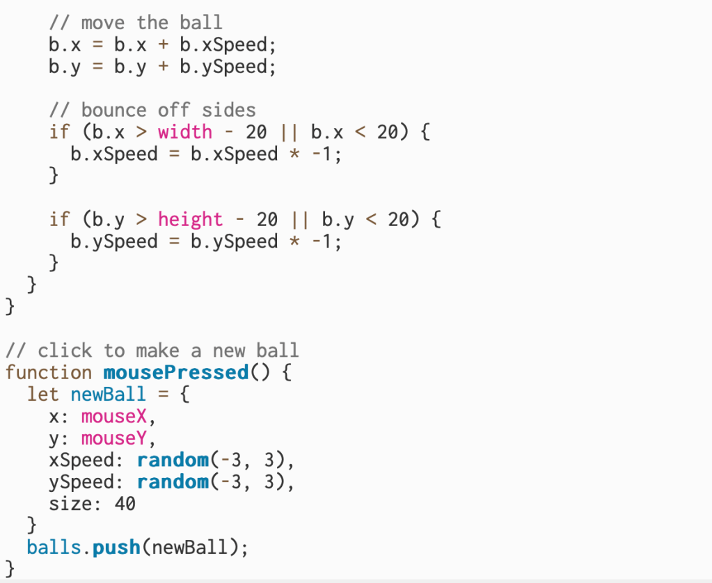 For this part of my project, I built on my bouncing ball sketch and made it interactive. I added a feature that lets me create a new pink ball anywhere I click on the canvas. Each time I click, a new ball appears in that spot with its own random speed and direction, then starts bouncing like the rest. I also updated my setup so that all the new balls follow the same movement and bounce rules.
