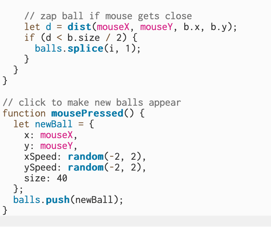For this part, I added a feature that lets me delete a ball when my mouse moves over it. When I hover close to a ball, it disappears from the canvas. I used the distance between the mouse and the ball to tell when they’re touching, and then I remove that ball from the list. It’s a small detail, but it makes the sketch feel more interactive.