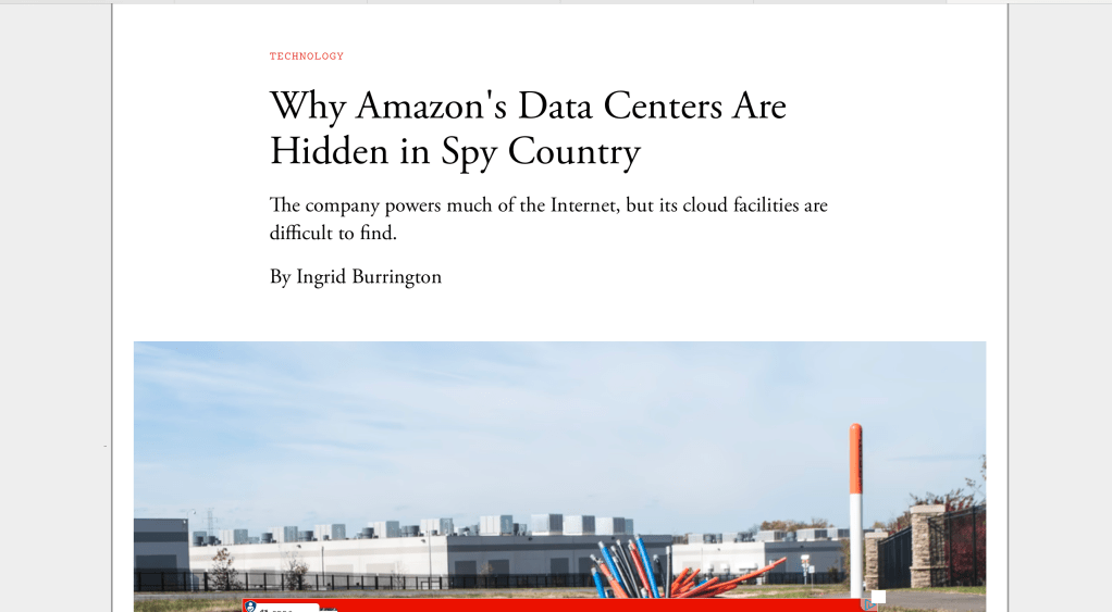 Ingrid Burrington’s piece pulls back the curtain on something we don’t usually think about — the physical side of “the cloud.” She takes readers through northern Virginia, a region filled with plain-looking warehouses that actually power much of the internet through Amazon Web Services. What I liked most about her approach is how she makes the invisible visible. These massive data centers are hidden behind gates and generic signs, yet they hold an enormous amount of power—literally and figuratively. Burrington breaks down how this secrecy isn’t just about security, it’s part of a larger narrative that keeps us detached from how the internet really works.