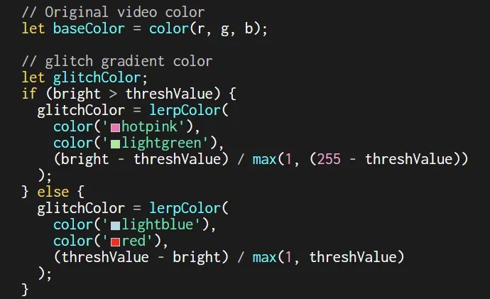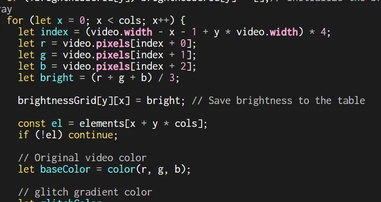 We mapped the webcam’s pixel brightness to each div by averaging the RGB values from the pixels[] array. Brighter pixels became pink or green, while darker ones turned blue or red, forming a constantly shifting mosaic of warm and cool tones.
