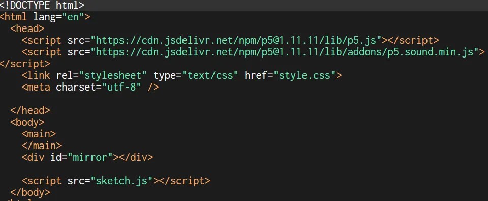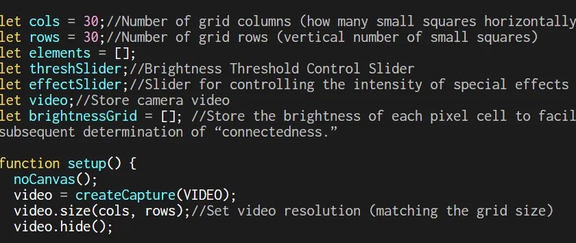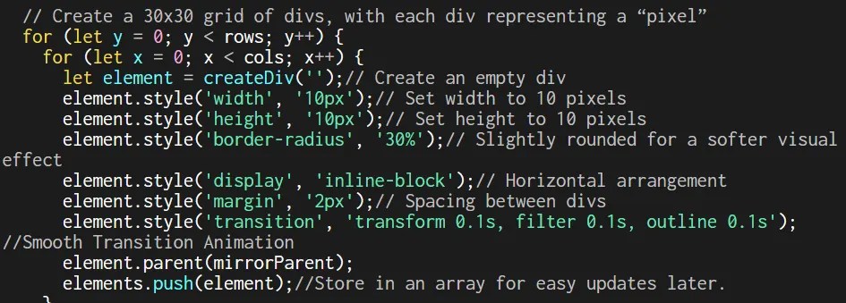 We began by setting up the webcam feed with createCapture(VIDEO) and resizing it to a 30×30 grid using video.size(cols, rows). We hid the original video and used video.loadPixels() to pull pixel data, turning each frame into a source for color blocks. Through two nested loops, we generated 30 columns and rows of divs, each one representing a pixel, and placed them inside a centered container called mirror.
