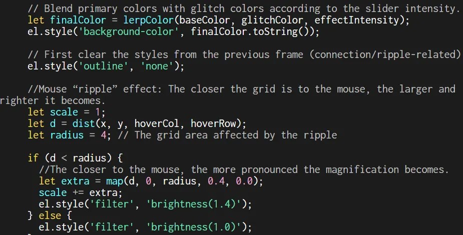 To make it interactive, we added two sliders: one controlling the brightness threshold and another for effect intensity. We then compared each pixel’s brightness to its neighbors; when two were similar, they shared a soft white outline, forming glowing clusters. Lastly, we created a mouse ripple effect where nearby pixels expand and brighten as the cursor moves across the grid, creating a subtle sense of touch and connection.
