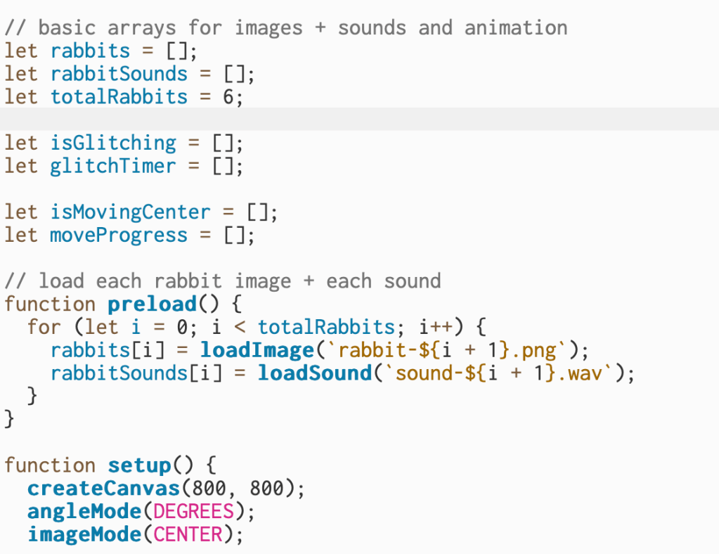 Each rabbit has both an image and a sound stored in matching arrays. The preload function is responsible for loading all of the images and sound files before the program starts running. Inside preload, each rabbit image is loaded into the rabbits array, and each sound file is loaded into the rabbitSounds array. This makes it easy to access the correct sound by using the same index number as the rabbit image, and ensures everything is available the moment the sketch begins.