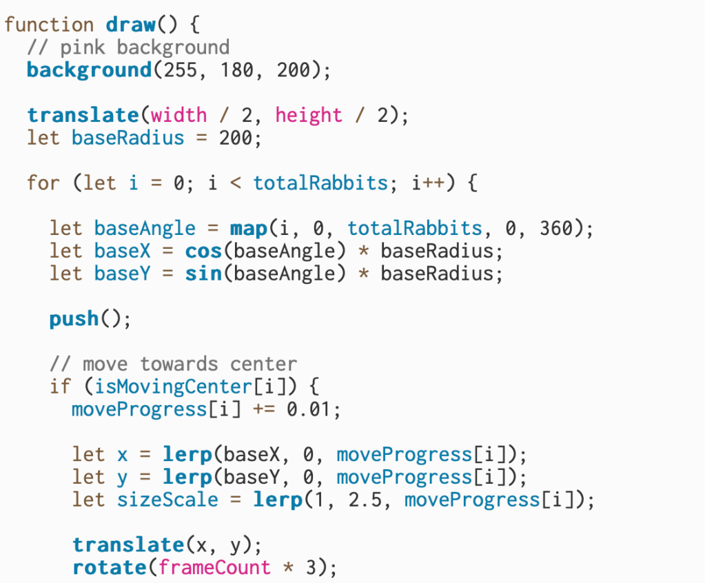 Sophia and I don’t typically listen to metal music, but after doing some research, we learned that it relies heavily on drums, guitars, and vocals to build a chaotic, high-energy rhythm. To play against that intensity, we decided to create a contrasting interactive music video. We chose light, playful images of bunnies, but once the user clicks on them, metal music kicks in and the visuals animate into a swirling, chaotic circle.
