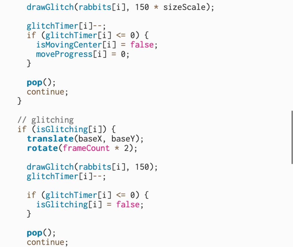 In this project, the sound works more like texture and mood rather than melody or rhythm. Each rabbit triggers its own short audio clip, and the sounds act as a layer that enhances the glitch effect rather than forming a structured musical pattern.