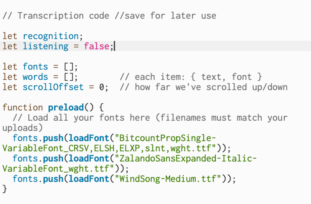 This section declares the variables that handle speech recognition, track whether the mic is active, store the uploaded fonts, and keep each spoken word with its assigned font. The scrollOffset variable keeps track of how far the text has moved on the screen. The preload function runs first and loads all of the font files so they’re ready to use when the sketch begins.