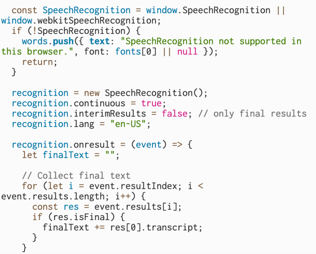 This part checks whether the browser supports speech recognition and, if it doesn’t, displays a message instead of running the rest of the program. If it is supported, it creates a new speech recognition object, sets it to keep listening continuously, turns off interim results so only finalized text is used, and sets the language. Inside the onresult function, the code collects only the final transcribed text from each result and saves it so it can be processed word by word.