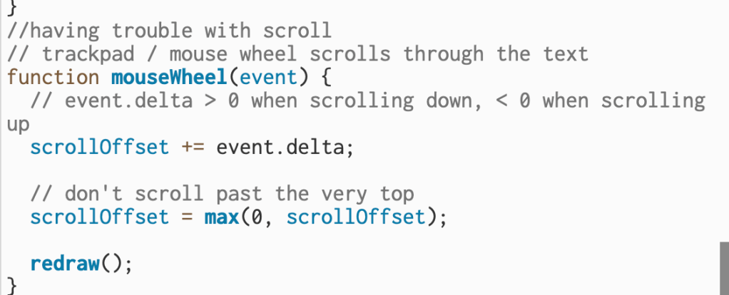 Throughout the code I am managing live speech input, assigning random fonts to each word, and keeping the text moving upward as more words appear. However, this section is where I had trouble: getting the scrolling to behave consistently. The mouseWheel function is supposed to let the trackpad or mouse control how far up or down the text moves, but fine-tuning the scrollOffset values so the movement felt natural took some trial and error.
