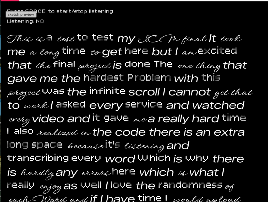 I decided to combine my P5 final with my ICM final by creating a project that connects audio, typography, and eventually physical computing. The goal was to start with speech-to-text in P5, then later integrate my breadboard mic so I can track sound input or use a potentiometer to control background colors. I began in P5 by choosing three fonts from Google Fonts that felt visually distinct. After downloading them, I uploaded each font file directly into the P5 editor so I could randomly apply them to every word that appears on the screen as I speak.